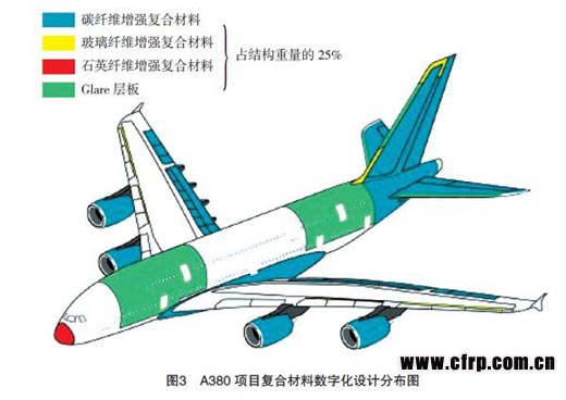 空客公司在整個(gè)A350 XWB項(xiàng)目、A380復(fù)合材料項(xiàng)目中完成了對所有復(fù)合材料零件的CATIA平臺(tái)設(shè)計(jì),并使用復(fù)合材料設(shè)計(jì)模塊完成數(shù)字化的設(shè)計(jì)制造任務(wù)。以空客A380(圖3)為例:其復(fù)合材料用量占到結(jié)構(gòu)重量的25%,機(jī)身段、尾翼段、襟副翼的設(shè)計(jì)制造都是采用CPD模塊對設(shè)計(jì)制造流程進(jìn)行優(yōu)化。空客公司的工程師用CATIA定義模具面、層的位置和邊界、泡沫夾芯的位置等。CPD軟件將層管理起來,為每個(gè)層自動(dòng)生成表格,記錄非幾何信息與層的邊界、相關(guān)的標(biāo)記等聯(lián)系起來,確保層在制造過程中能正確定位。CPD的文檔功能,生成鋪層圖、鋪層表、材料表和序列表,從而使空客的復(fù)合材料設(shè)計(jì)工作時(shí)間降低了約50%,采用了新技術(shù)和軟件設(shè)計(jì)制造復(fù)合材料部件后,空客公司節(jié)省了5%~25%的初始設(shè)計(jì)時(shí)間,減少了45%的反復(fù)設(shè)計(jì)修改時(shí)間,極大地降低了手工鋪層的時(shí)間,達(dá)到了全過程控制復(fù)合材料鋪層,消除了反復(fù)試驗(yàn)的過程,提高產(chǎn)品質(zhì)量的同時(shí)最大限度地降低了產(chǎn)品的廢品率。