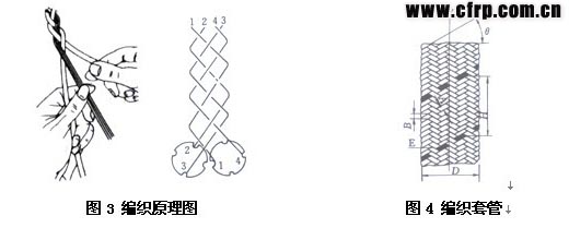 編織是一種古老的織造技術(shù)。編織物(braid)所有的纖維均斜交,與軸線夾角不呈0°與90°。編織原理與編織管如圖3、圖4所示。編織過程腫,纖維的運(yùn)動軌跡為螺旋線。選擇合理的纖維角度可調(diào)節(jié)成品管材徑向強(qiáng)度與軸向強(qiáng)度的比例;選擇適宜的纖維排列密度可滿足強(qiáng)度與外觀的要求。